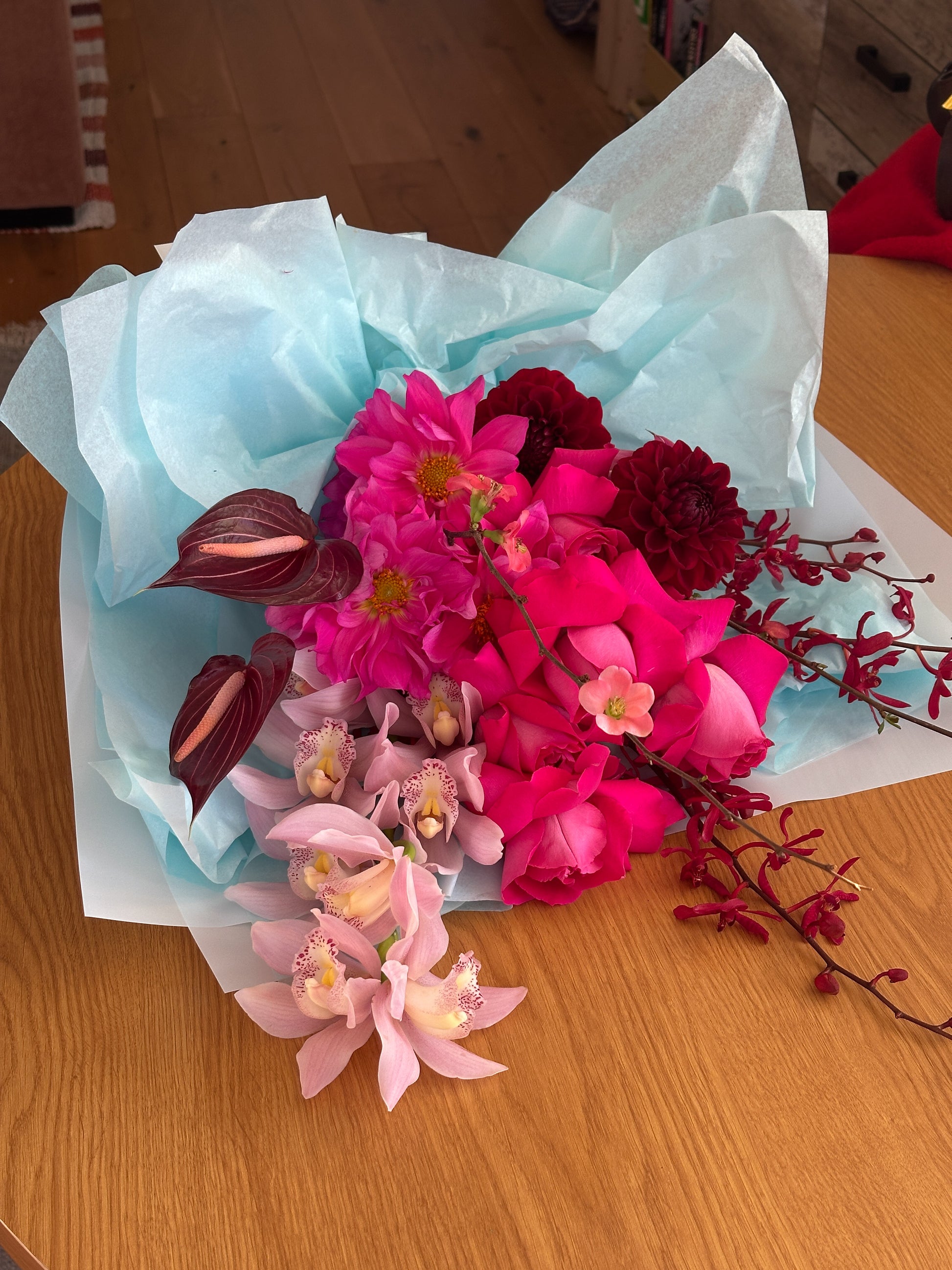 Wrapped in our signature blue Budsie wrap. Colours, stems and styles change with the day’s freshest market blooms.