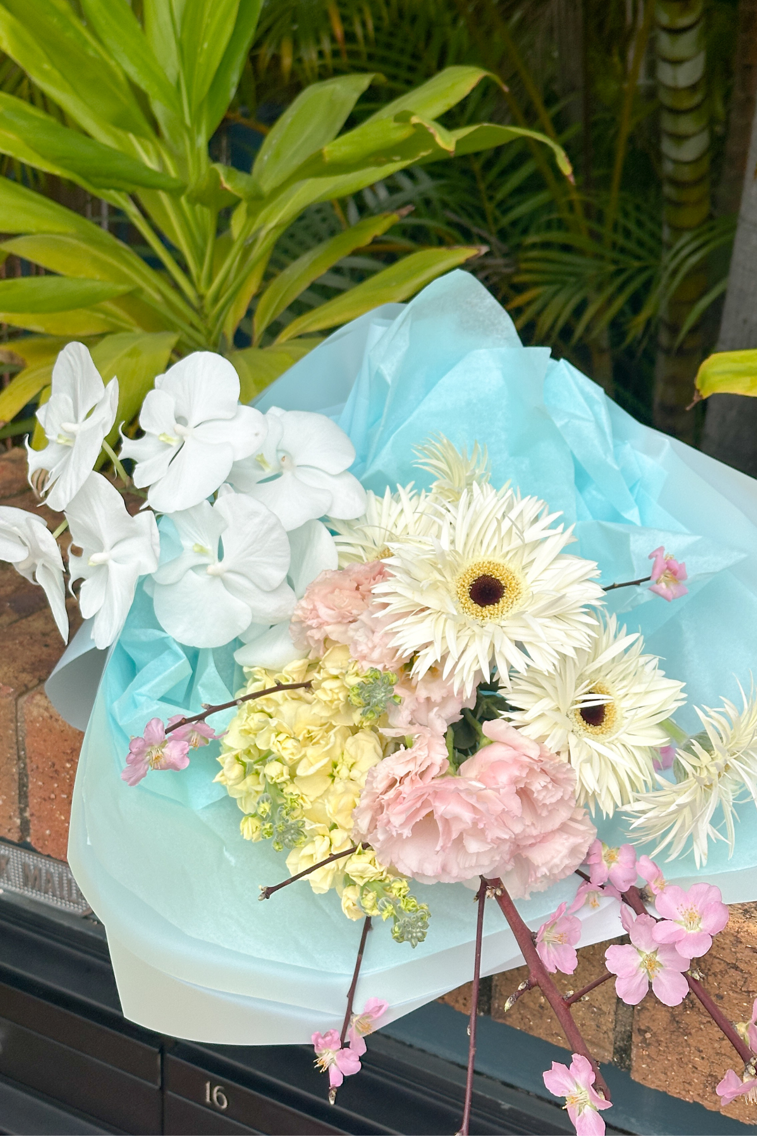 Wrapped in our signature blue Budsie wrap. Colours, stems and styles change with the day’s freshest market blooms