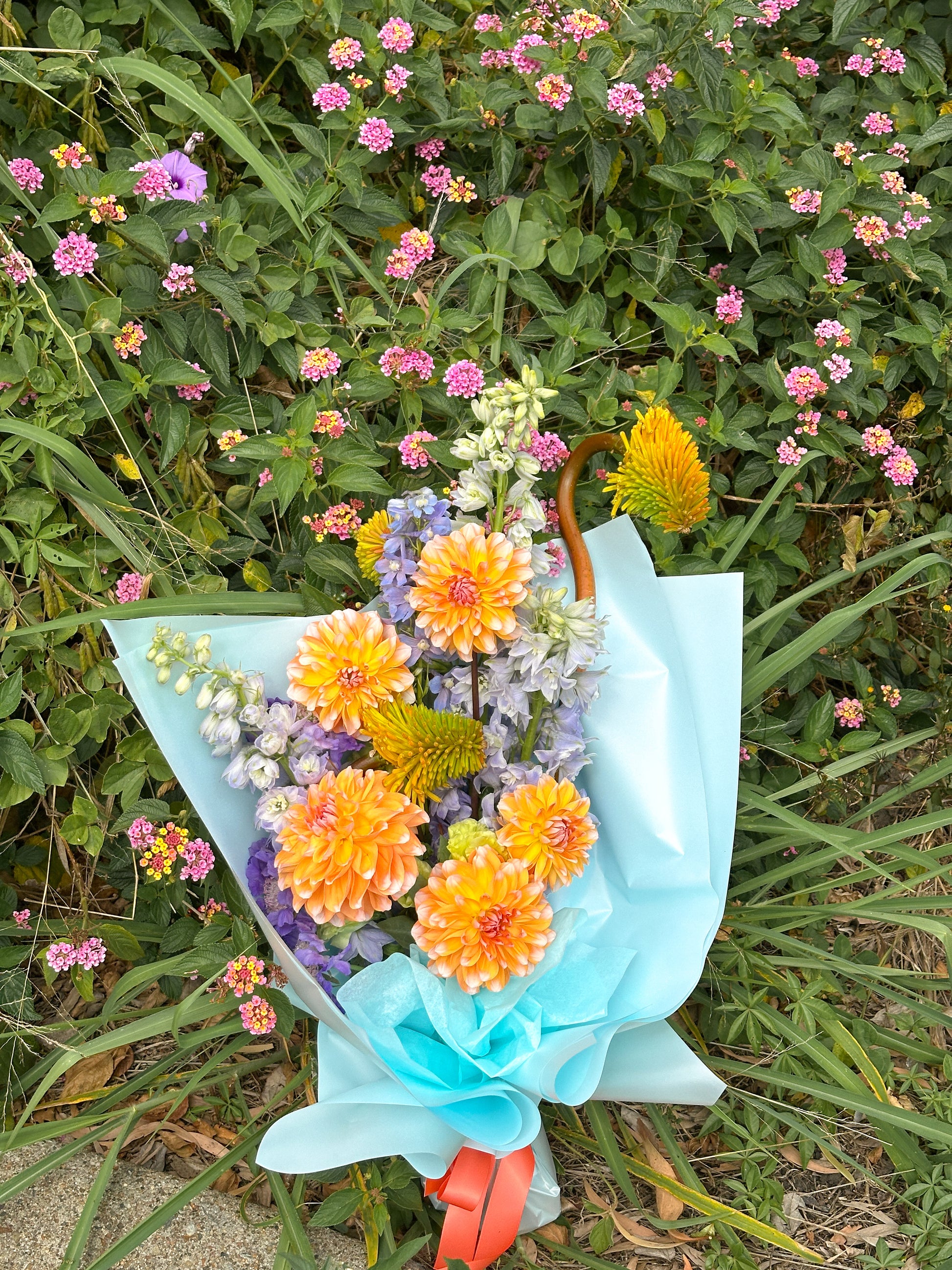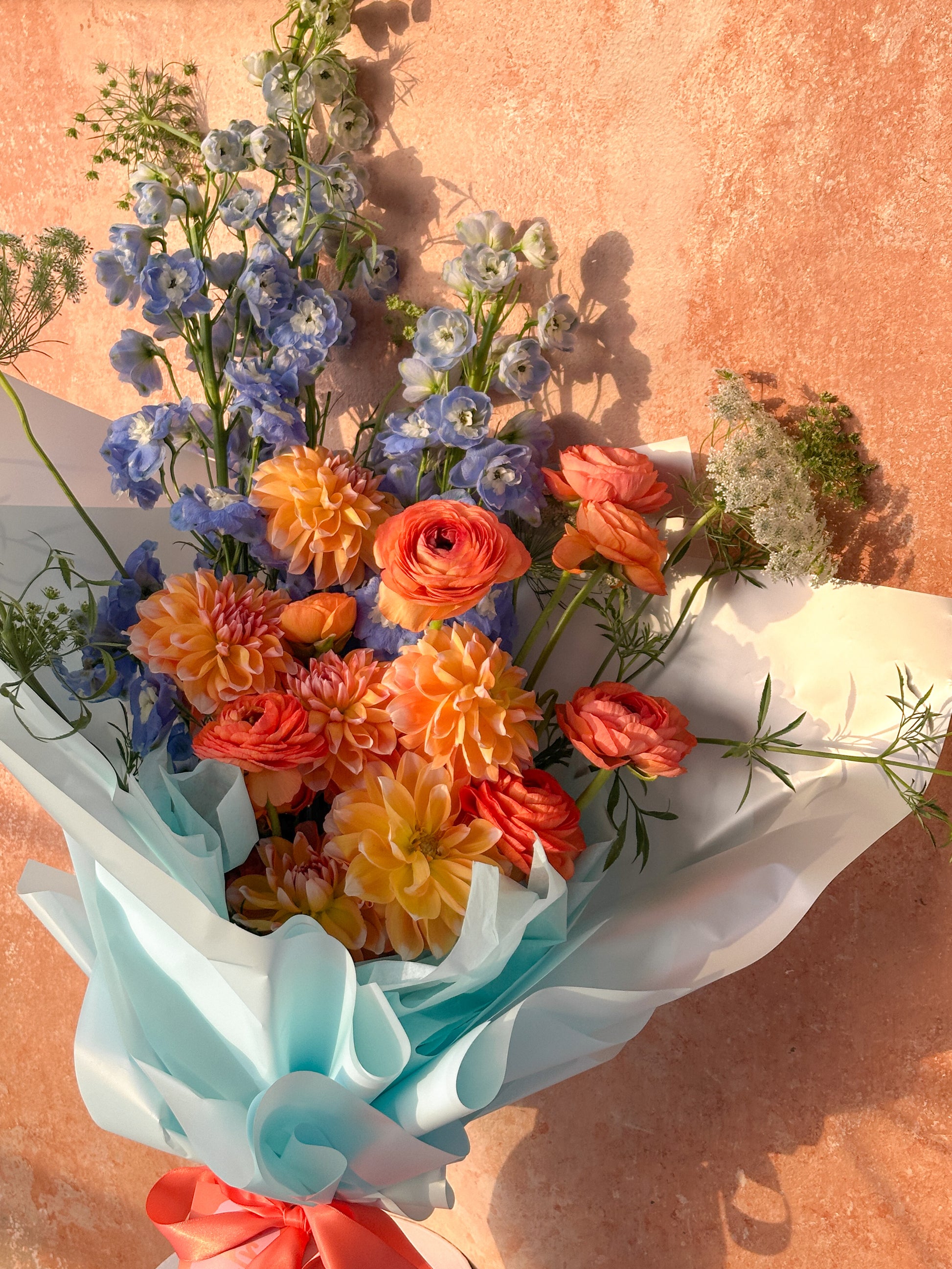 Wrapped in our signature blue Budsie wrap. Colours, stems and styles change with the day’s freshest market blooms.